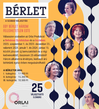 Az ORLAI Produkció évről évre a minőségi szórakoztatás jegyében hoz létre előadásokat, és nyújt kedvezményeket a törzsközönségének. Így lesz ez a következő évadban is, amelyre már most megvásárolhatóak az ORLAI PRODUKCIÓ Belvárosi Színházban és a 6színben játszott előadásaira, három alkalomra érvényes szabadbérletek. 25 produkcióból választhatnak a nézők, amelyek között az évek óta játszott sikerek, az új kedvencek és a következő évad bemutatói egyaránt megtalálhatók. A rendkívül kedvező árú, három szabadon választott előadásra érvényes bérlet három árkategóriában már kapható! Az AKCIÓ 2023. június 30-ig tart!