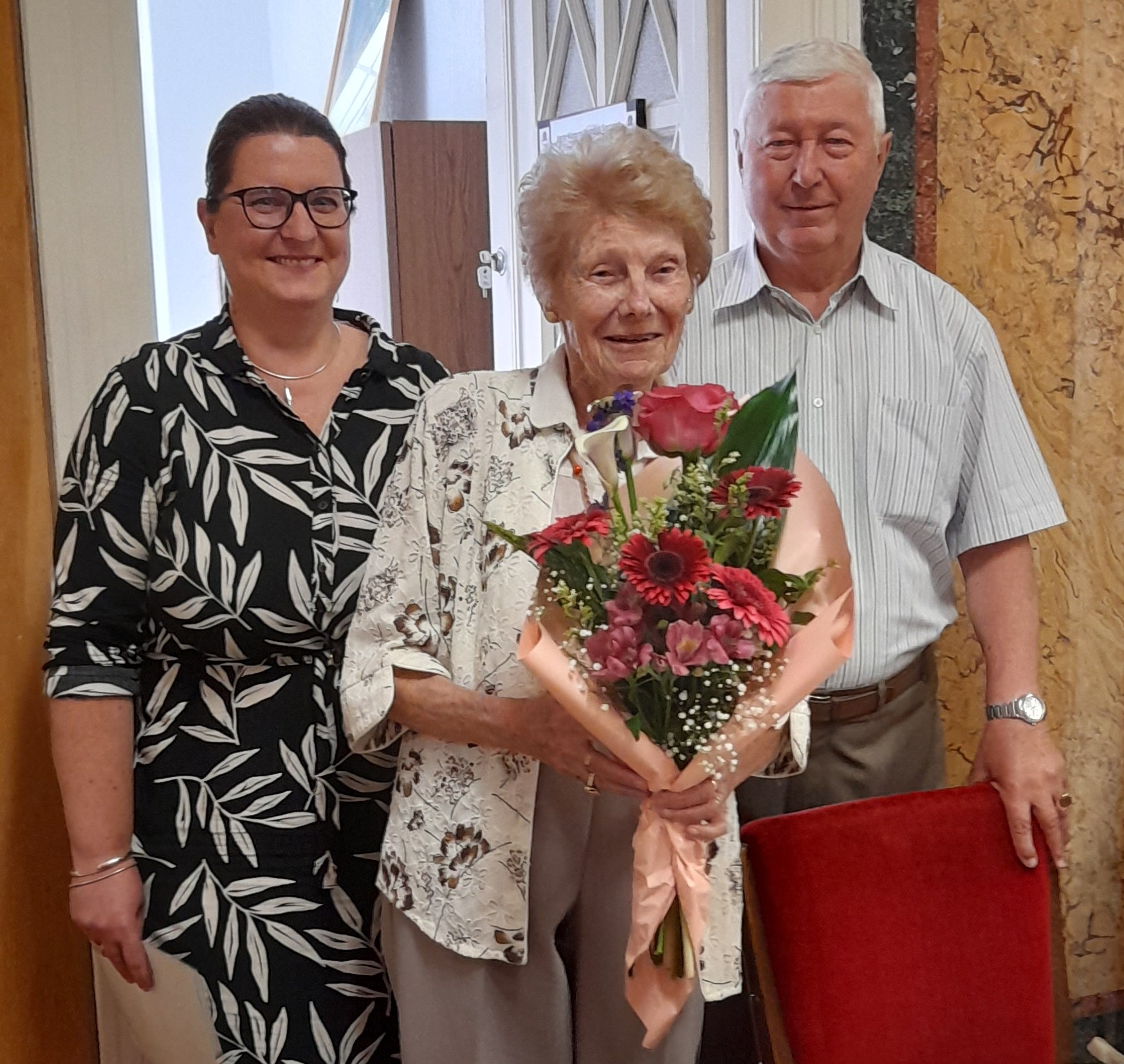 Ezt követően az IB tagjai és dr. Balogh Lívia elnökasszony Huszti Györgynét (Györgyikét) köszöntötték, aki a 90. születésnapját töltötte be. Huszti Györgyné évtizedekig a BHG szakszervezetét, majd annak megszűnését követően a nyugdíjasokat képviselte a Vasas testületeiben.