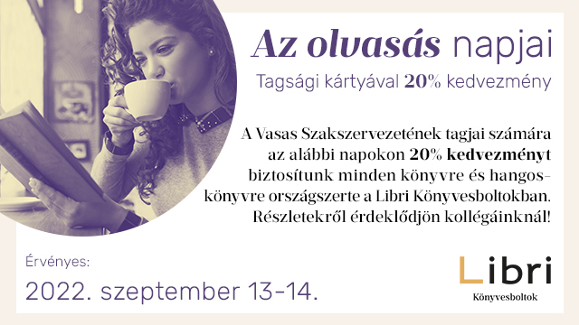 Elmúlt a nyár, beköszöntött a hűvösebb idő és elkezdődött az iskola is. Szükségünk van könyvekre és egyre több új olvasnivalóval állnak elő kedvenc íróink. Tehát, irány a könyvesbolt! Ahogy már korábban olvashattátok a Vasas tagjainak 20% kedvezményt nyújtanak a Libri könyvesboltok. Éljetek a lehetőséggel szeptemberben is! Akciós napok: szeptember 13-14.