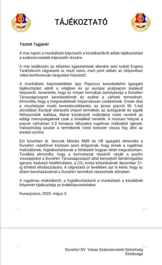 Tegnap a Dunaferr cégvezetője elektronikus levélben tudatta a munkavállalókkal, hogy az áprilisi fizetésüket, a május 10.-i határidőt kitolva, május 15.-ig fogja kifizetni. Azt is előrevetíti írásában, hogy az év elején a szakszervezetekkel kötött bérmegállapodás egyes elemeit, jelesül a májusi 3,4%-os alapbérfejlesztést - tekintettel a munkavállalók járványügyi helyzetben tanúsított helytállására – kifizeti, de a szabadságos bér és az alapbérfejlesztés második ütemének végrehajtása állami segítség nélkül nem kerül teljesítésre.